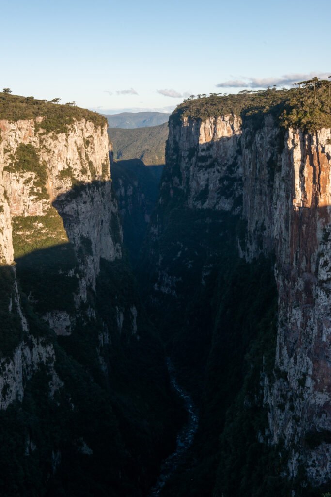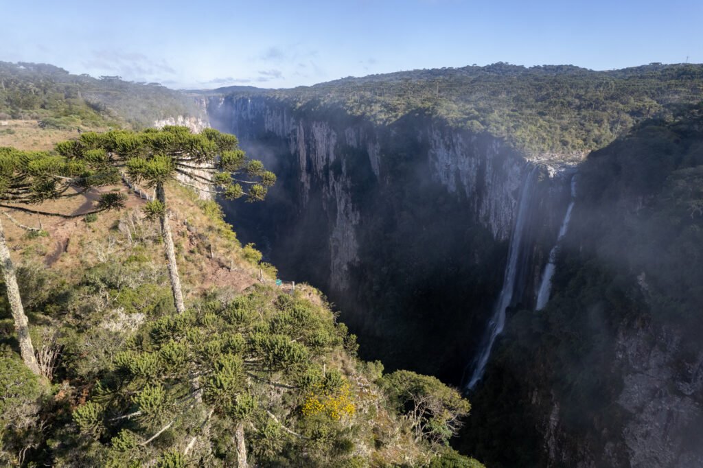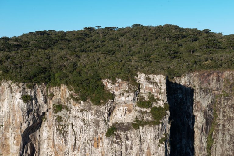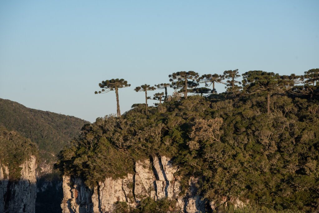 Araucárias de feições centenárias, com troncos e copas de grandes dimensões, desenham o topo dos abismos do Itaimbezinho.