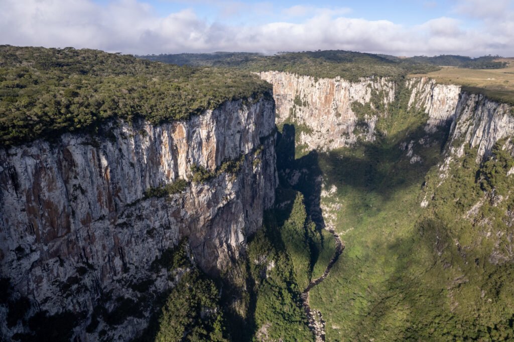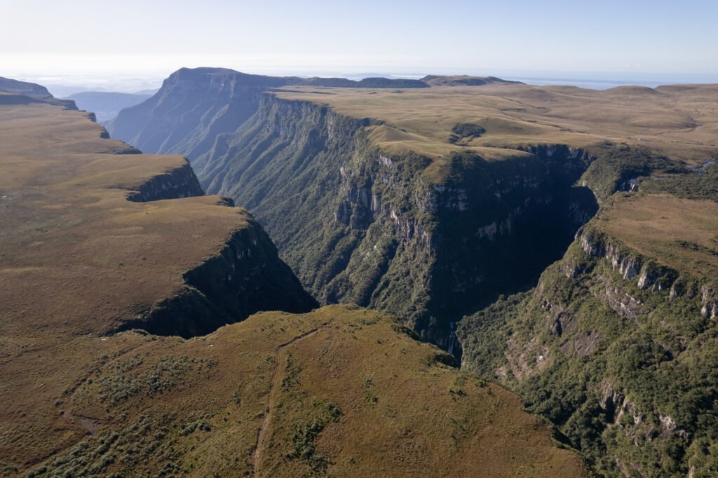 Vista aérea dos peraus, bordas e campos do Fortaleza, no Parque Nacional da Serra Geral. Visão a partir da face norte do cânion; vê-se o perau da cascata do Tigre Preto, principal curso de águas do desfiladeiro.
