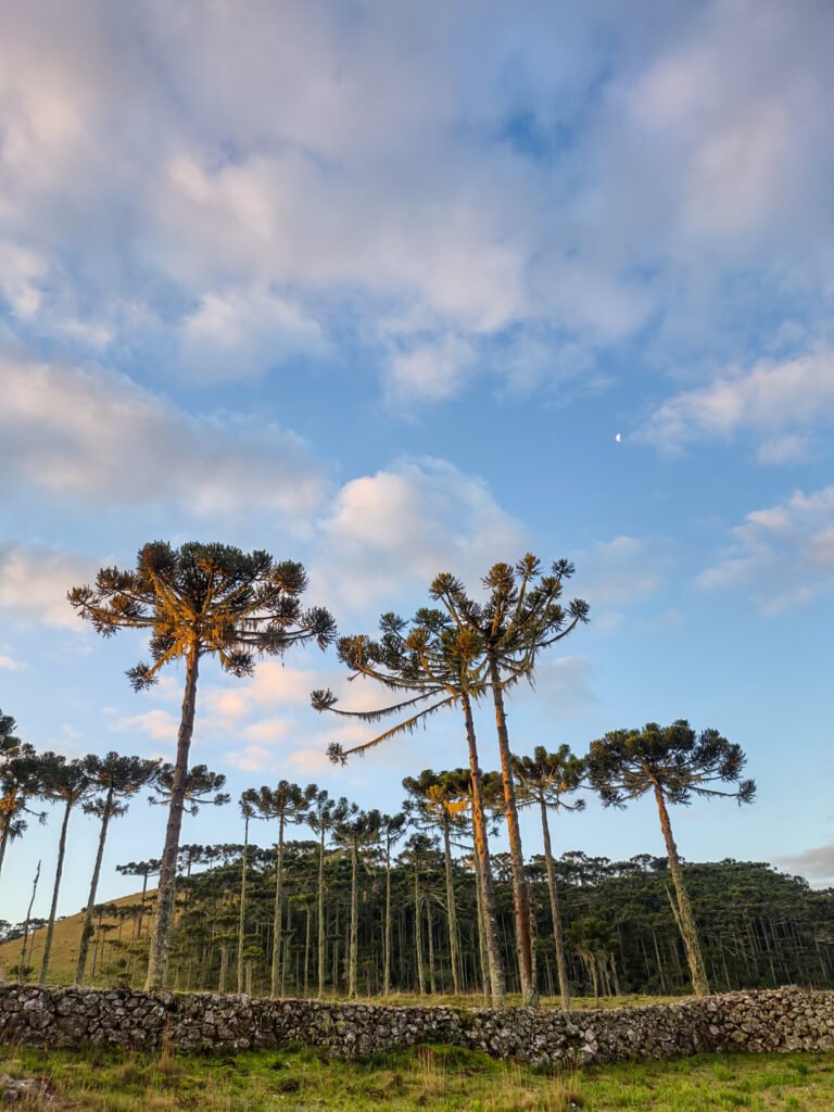 As araucárias me comovem onde quer que cresçam. Em terras gaúchas, no Paraná, Santa Catarina. Em altitudes de São Paulo, na Serra da Mantiqueira em Minas, ou em serras fluminenses. No entanto, não as havia admirado em campos tão extensos como os da região dos Aparados da Serra. Centenas de bosquezinhos despontando entre a vegetação baixa das suaves inclinações curvas dos campos dobrados, os vazios dos relvados permitindo abrilhantar a percepção desses capões. Inesperadamente, a plácida paisagem do planalto parece ter explodido, graças à repentina ruptura da levemente sinuosa horizontalidade de uma paisagem campestre. O contraste é tão dramático, posso dizer traumático, que nos remete a indagações sobre que forças sobrenaturais teriam provocado fenômenos telúricos de tamanha suntuosidade e esplendor.