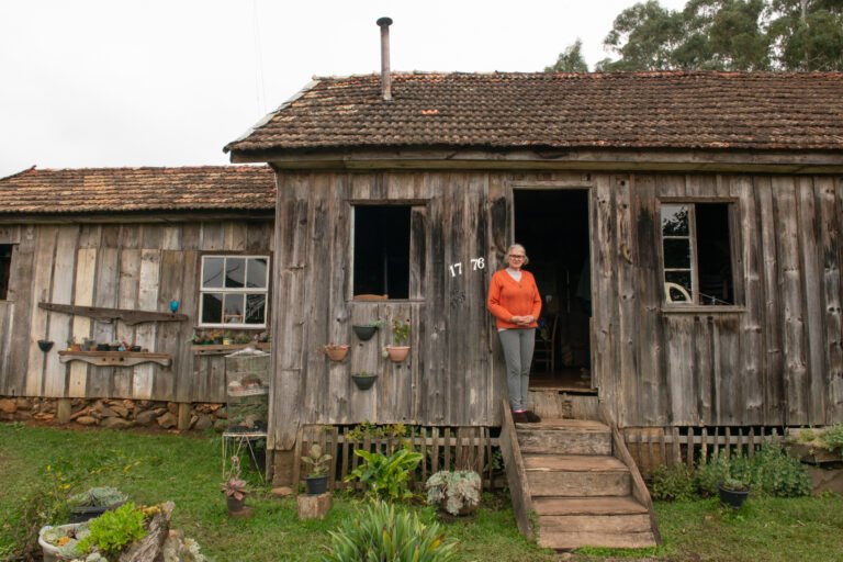 Casa tradicional de família remanescente do entorno do perau do Itaimbezinho, em Cambará do Sul, RS. À porta, Maribel Edira Klipel da Silva.