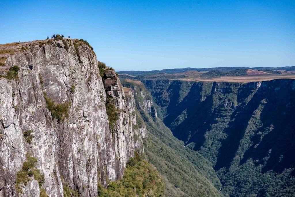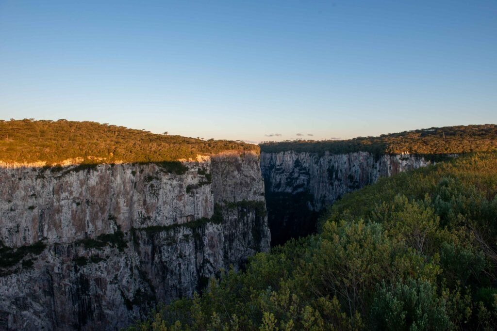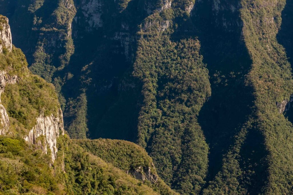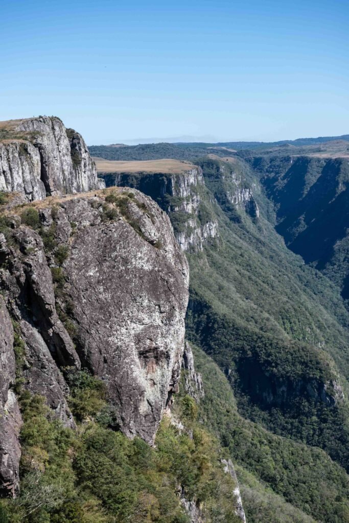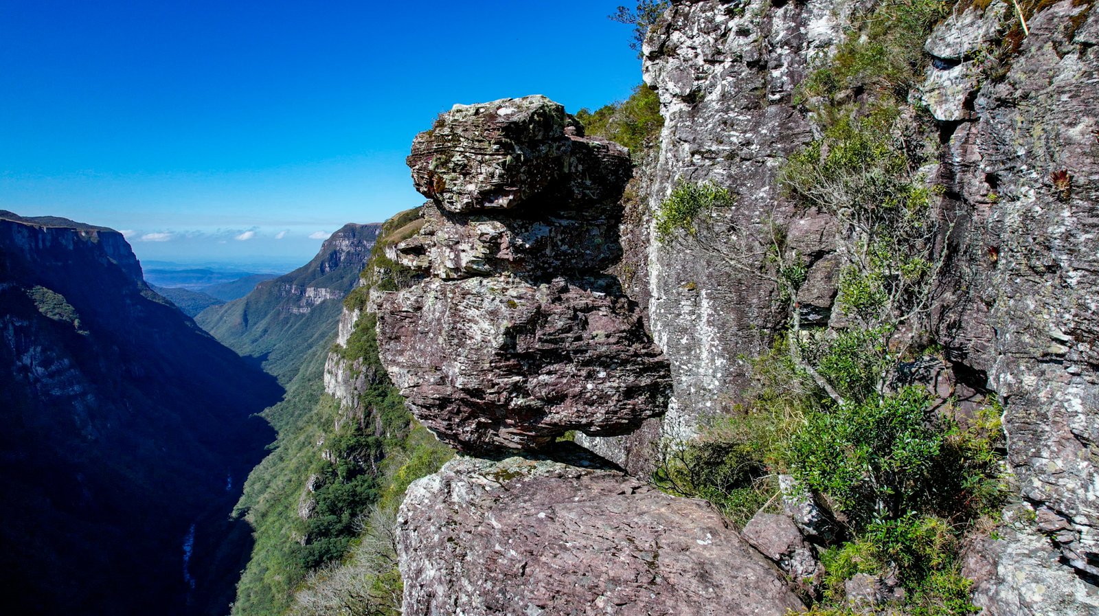 Visões das bordas norte e sul do cânion Fortaleza, no Parque Nacional da Serra Geral; trilhas dos penhascos; a Pedra do Segredo (equilibrada nos peraus próximos ao vértice do Fortaleza); vistas parciais da cachoeira do Tigre Preto e dos mirantes naturais do cânion.