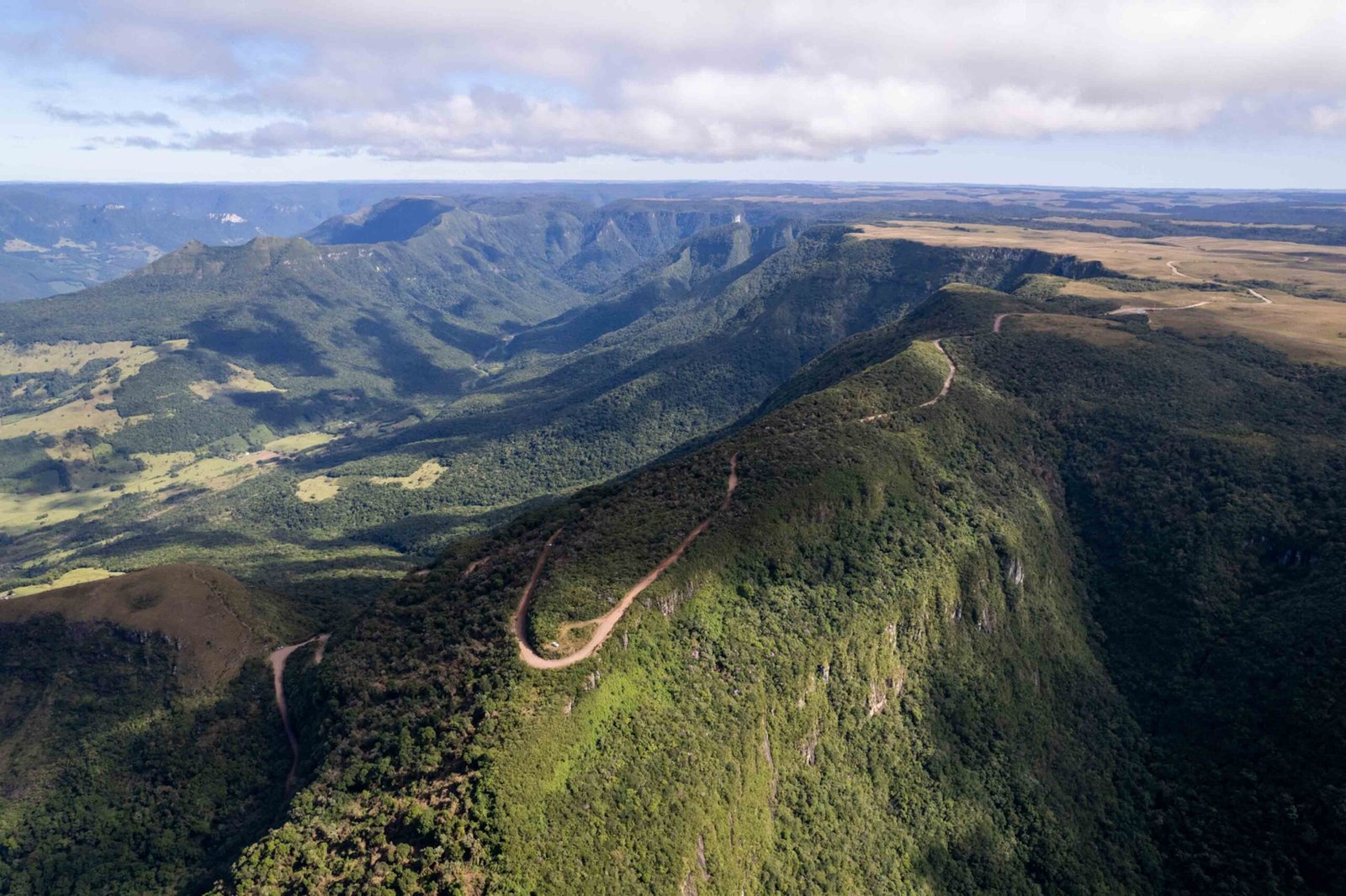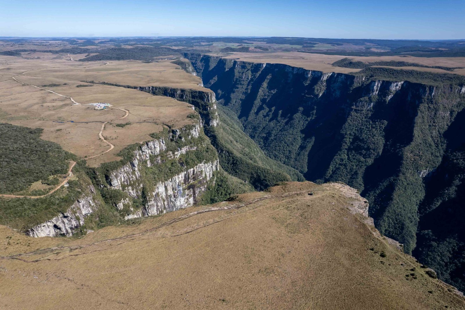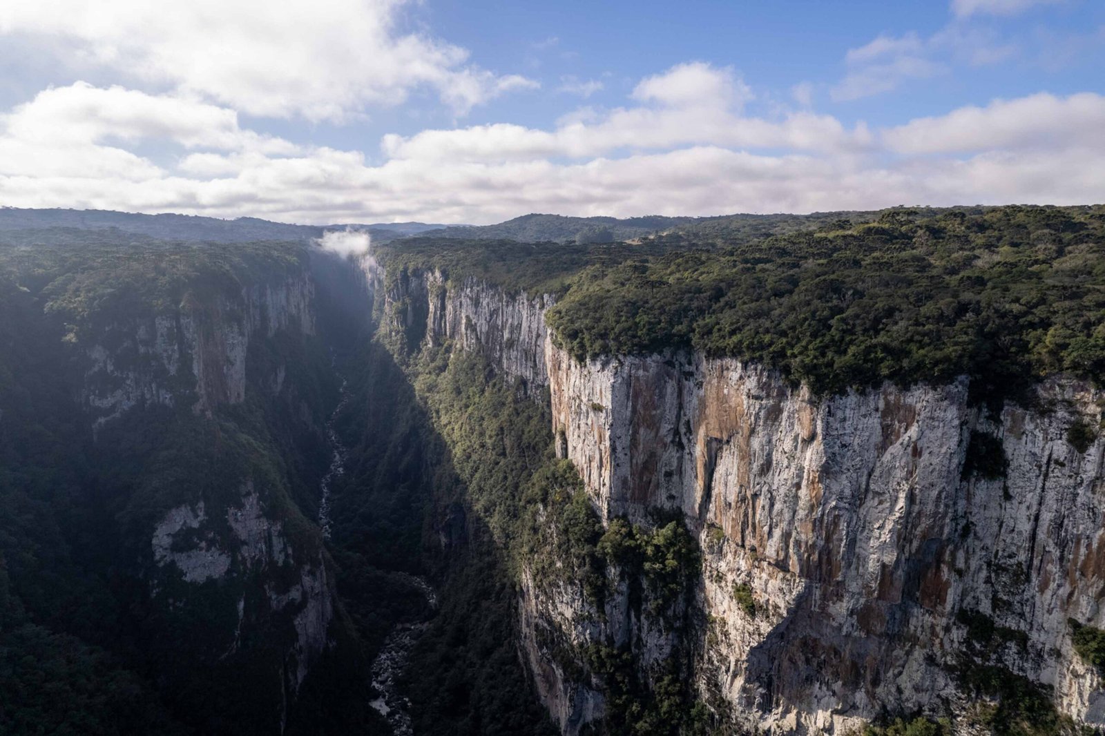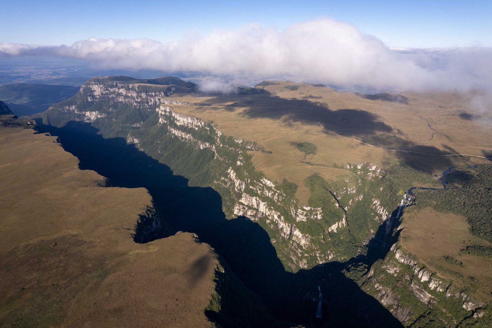 Conjunto de vistas aéreas do cânion do Itaimbezinho, a partir de navegação e registro com drone; e as visões dos peraus e arredores, em diversos ângulos e percursos no Parque Nacional dos Aparados da Serra.