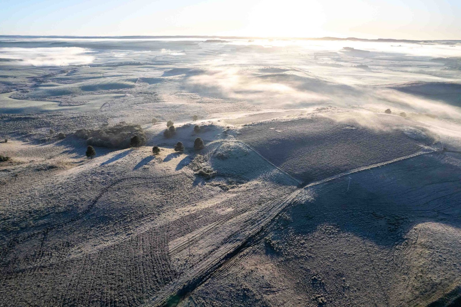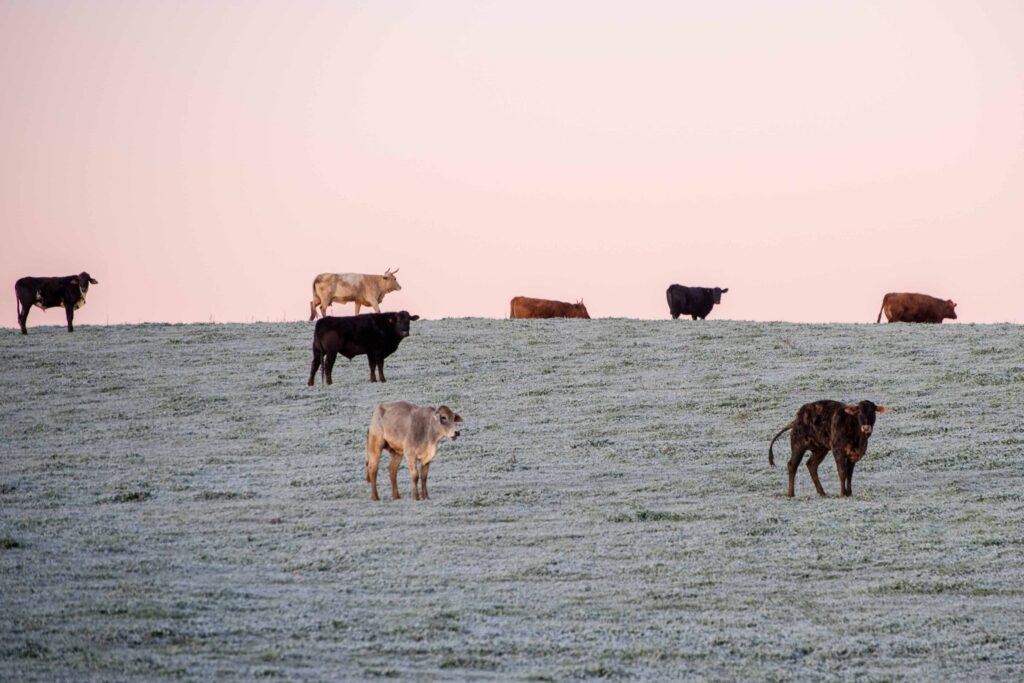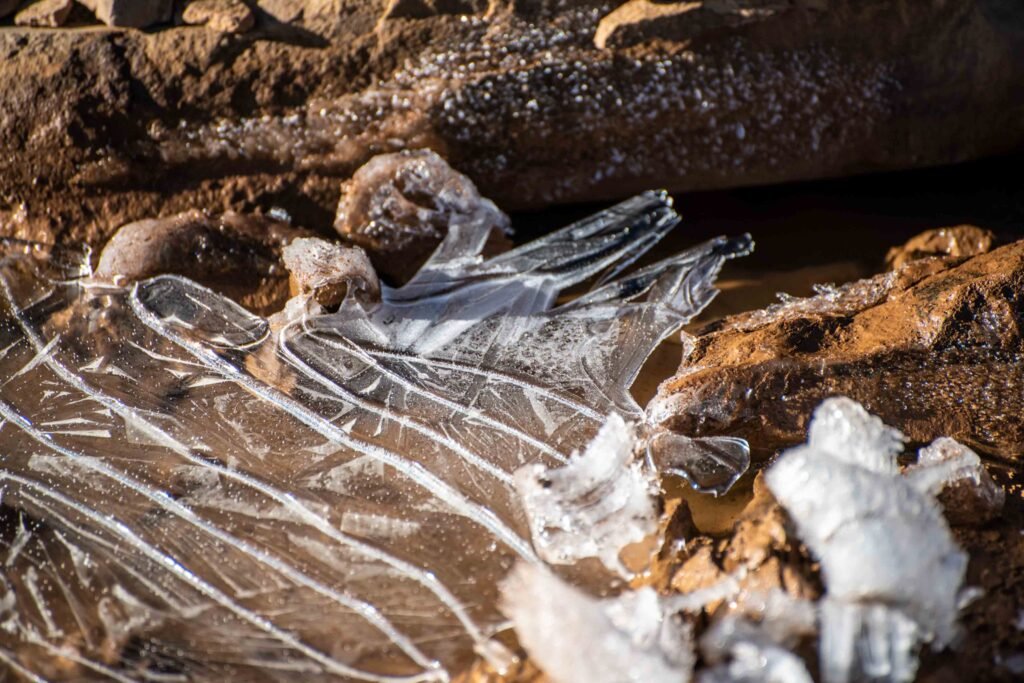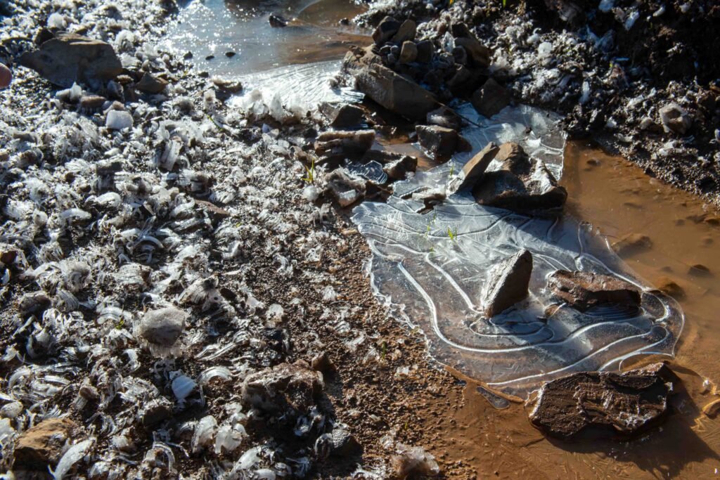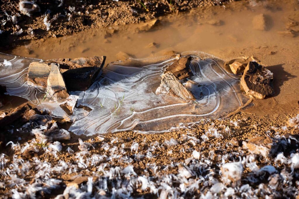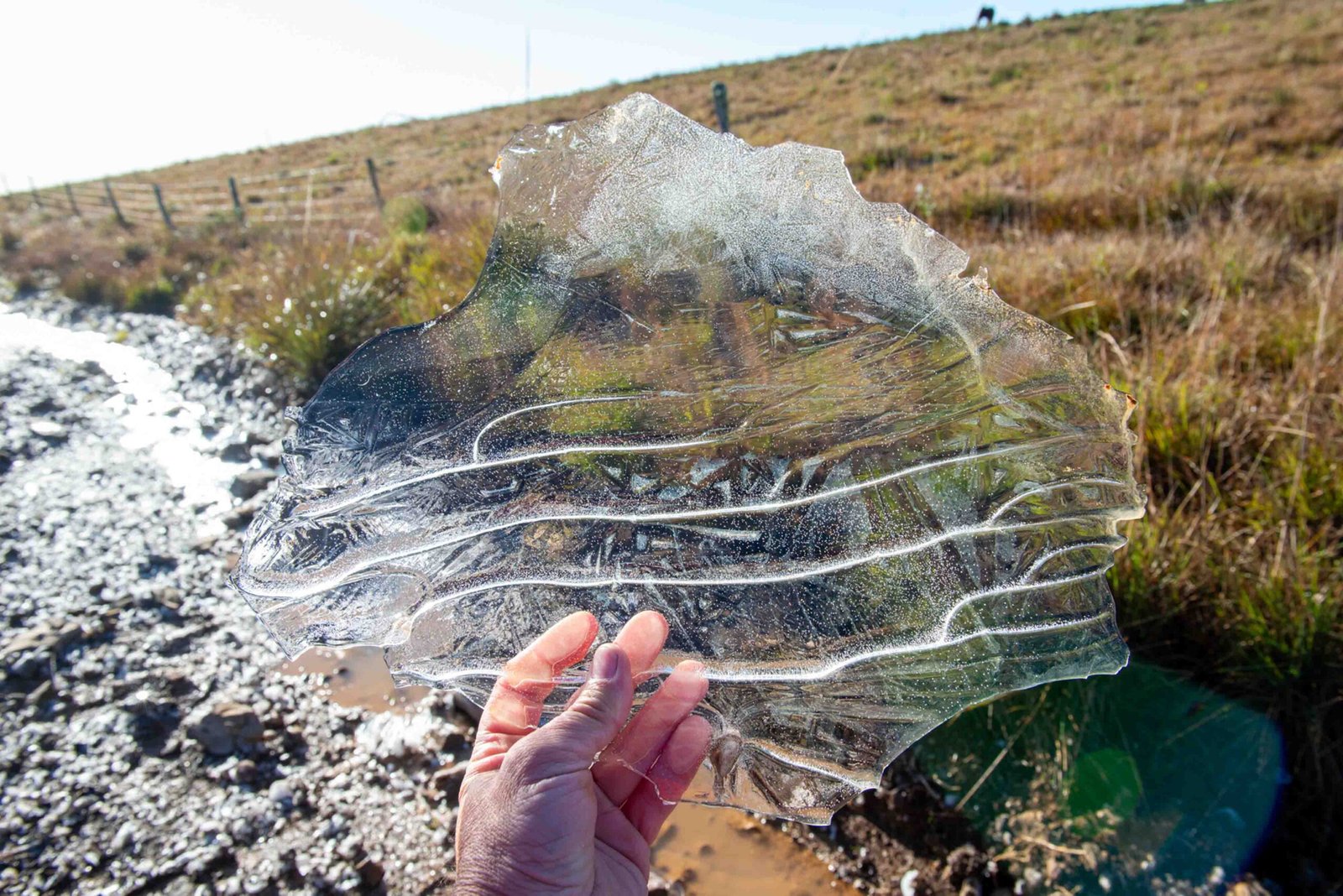 Série de registros em incursões aos Aparados e arredores dos cânions, em dias de inverno. Visão geral do Atalho do Crespo, estrada de campo na área de proteção do Itaimbezinho; desenhos do gelo ao amanhecer; um graxaim desconfiado e o gado na geada.