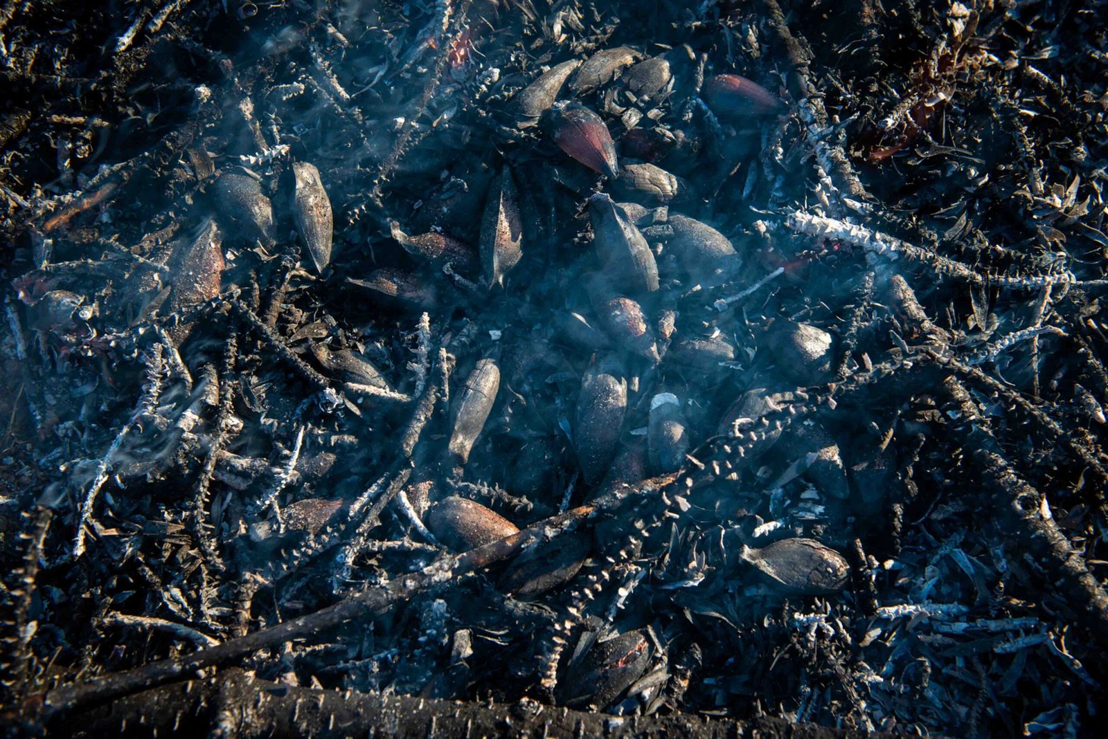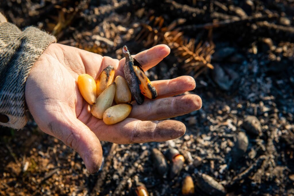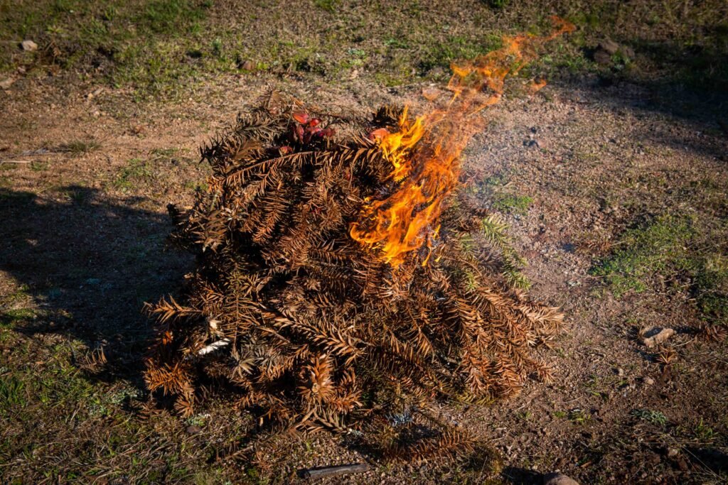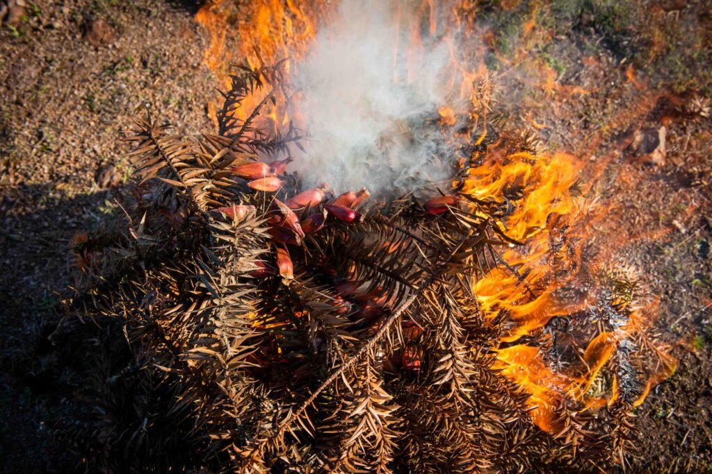 Registros de uma sapecada de pinhão, ou sapeco, termo da linguagem comum da região: as grimpas secas das araucárias são recolhidas e entrelaçadas, nem poucas nem em demasia; os pinhões, sementes maduras de araucária, são despejados no monte. Ateia-se fogo; alguém controla, espalha ou agrupa o braseiro com um bastão conforme os pinhões ficam tostados. A sapecada é um saber ancestral dos povos nativos da região; assimilado pelas etnias que ocuparam toda a região: portugueses, afrodescendentes e, depois, descendentes de imigrantes europeus.
